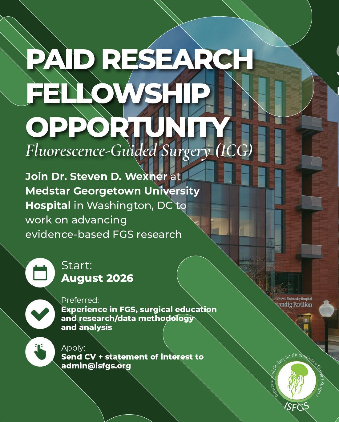 The research fellow will work with Dr Steven Wexner, the ISFGS North American chapter president to develop and validate metrics for the safe, appropriate, evidence-based use of fluorescence guided surgery. The fellow will interface with surgeons in all surgical disciplines across the MedStar Health system and with thought leaders around the world. Preference will be given to applicants with an established academic record in fluorescence-guided surgery and to individuals with advanced training and education in surgical education, test design, and psychometric analysis. The successful applicant will begin work during July or August 2026.